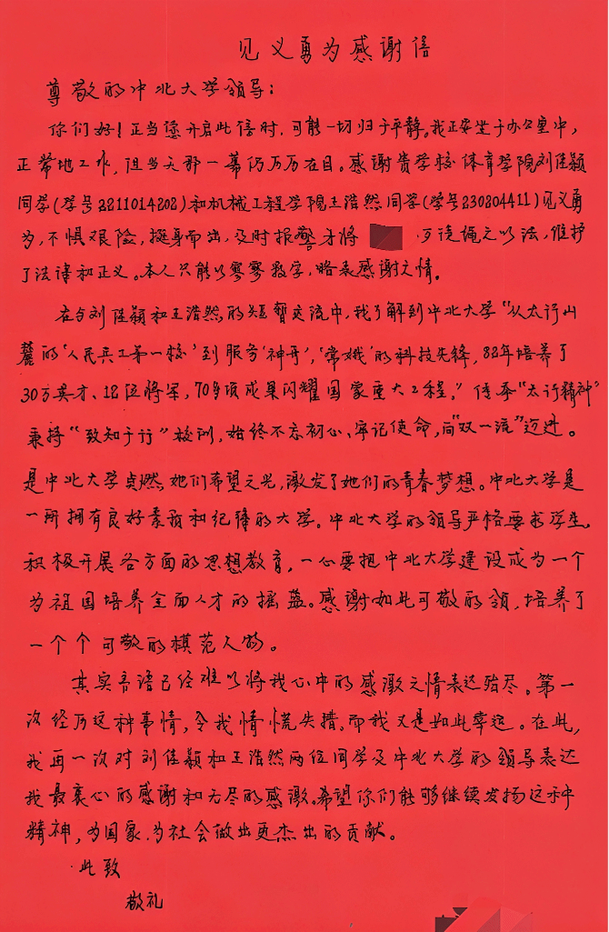 市民来信致谢我校学子见义勇为 青春担当彰显育人成效