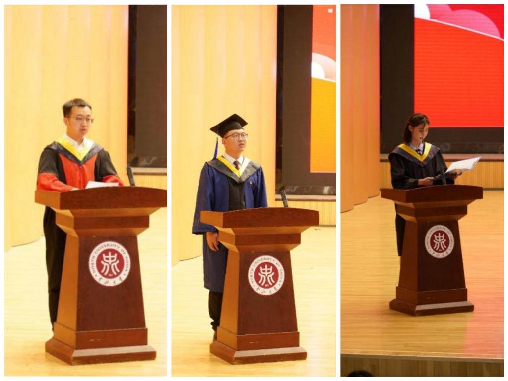 在学子发声环节,2025届优秀毕业生代表依次上台分享感悟。博士石宇槐讲述了自己在科研道路上的坚持与突破,立志未来继续深耕专业领域,助力科研进步;硕士沈新月聚焦实践创新,分享了参与项目的成长经历,表达了将永葆热忱、发光发热的决心;本科邓灵雨深情回顾了校园生活的点滴,向学院和老师们表达感恩之情,表示将带着学院赋予的底气勇敢追逐梦想。不同学历毕业生的分享,展现出多样的成长轨迹,却都饱含着对学院的感恩与对未来的憧憬。